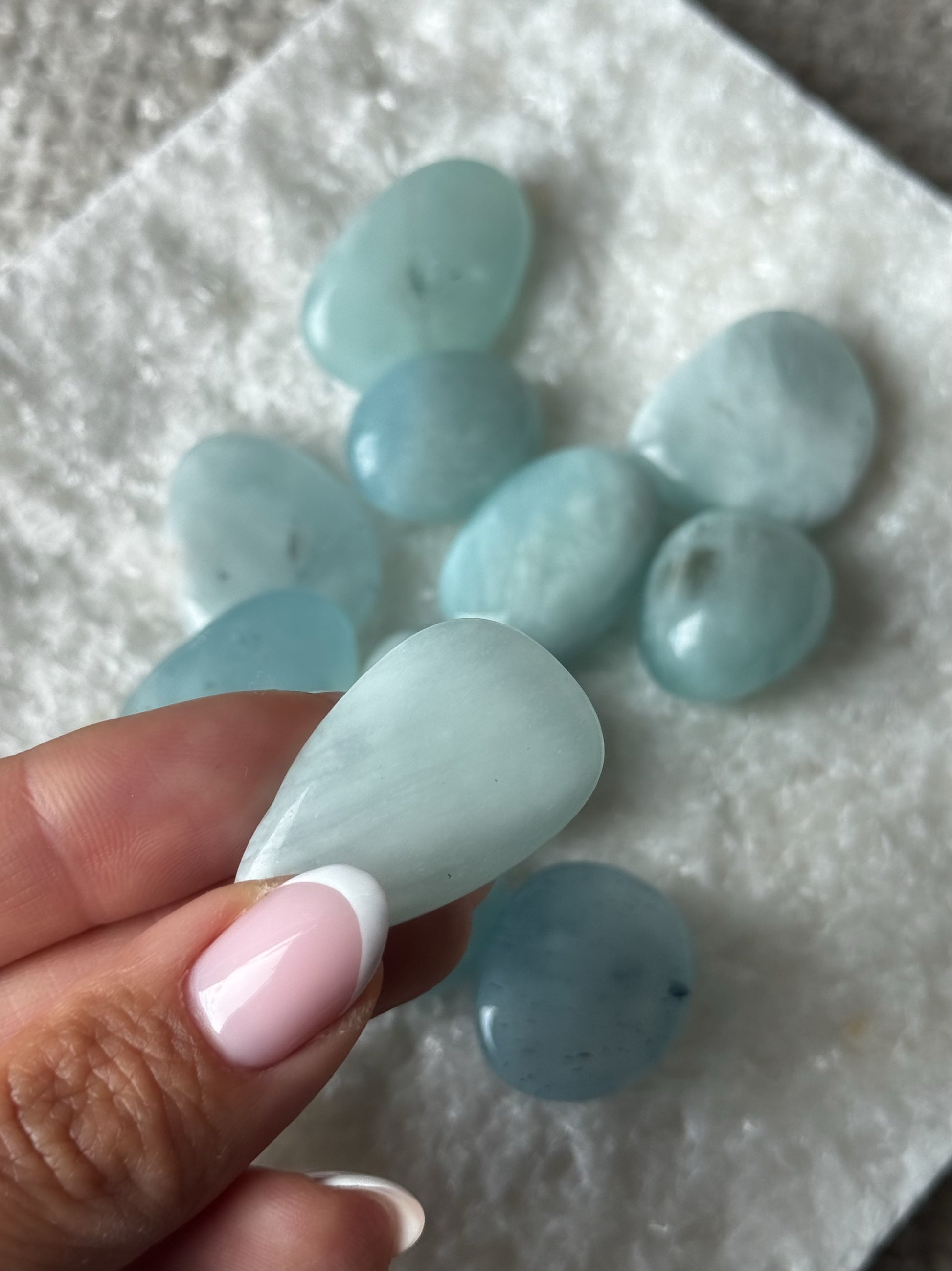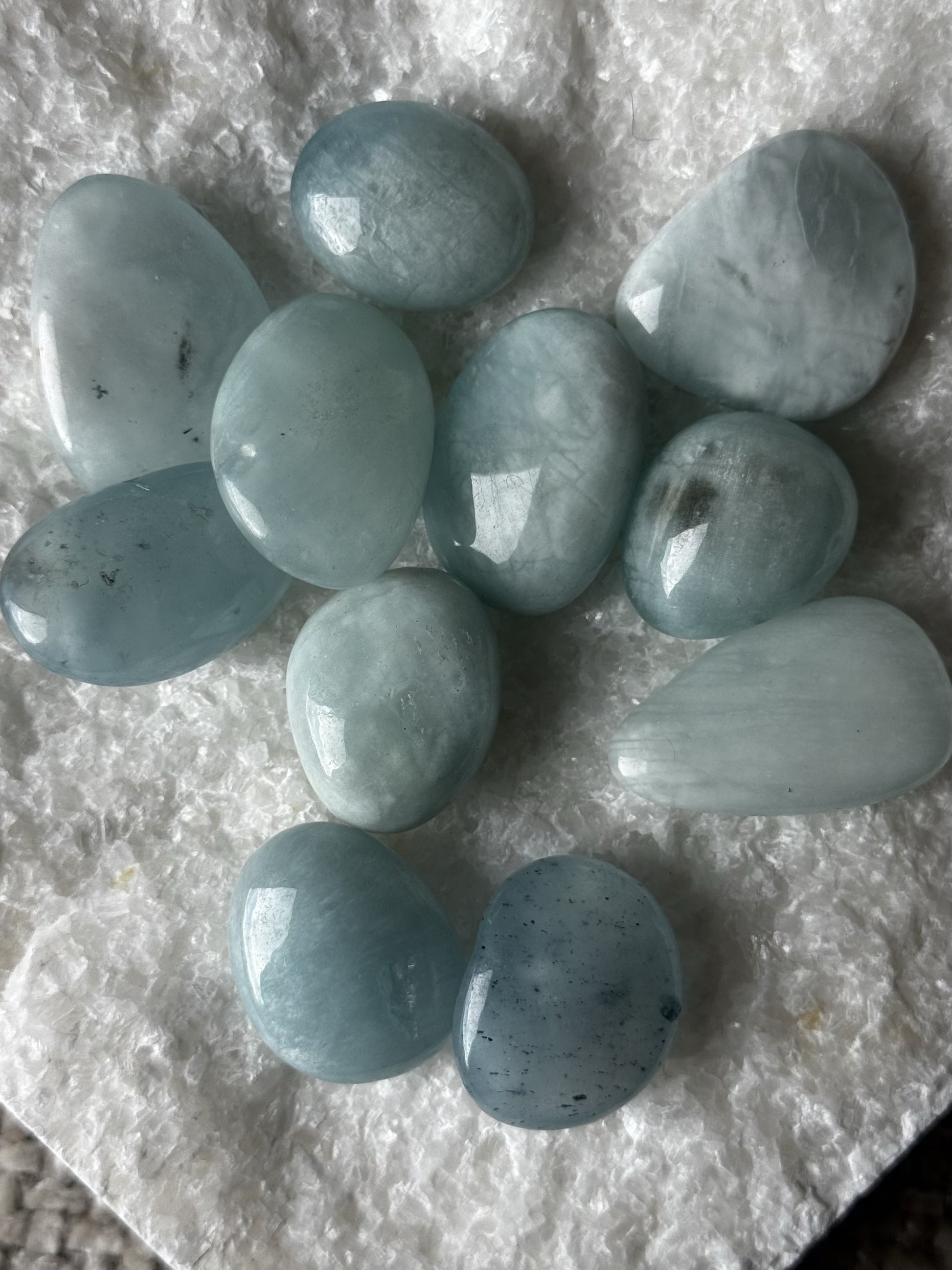 Je suis l'Aigue-Marine, je fais partie de la famille des béryls, comme l'émeraude. Autrefois j'avais la réputation de protéger les marins. Symbole de pureté, d'innocence, de bonheur et fidélité.