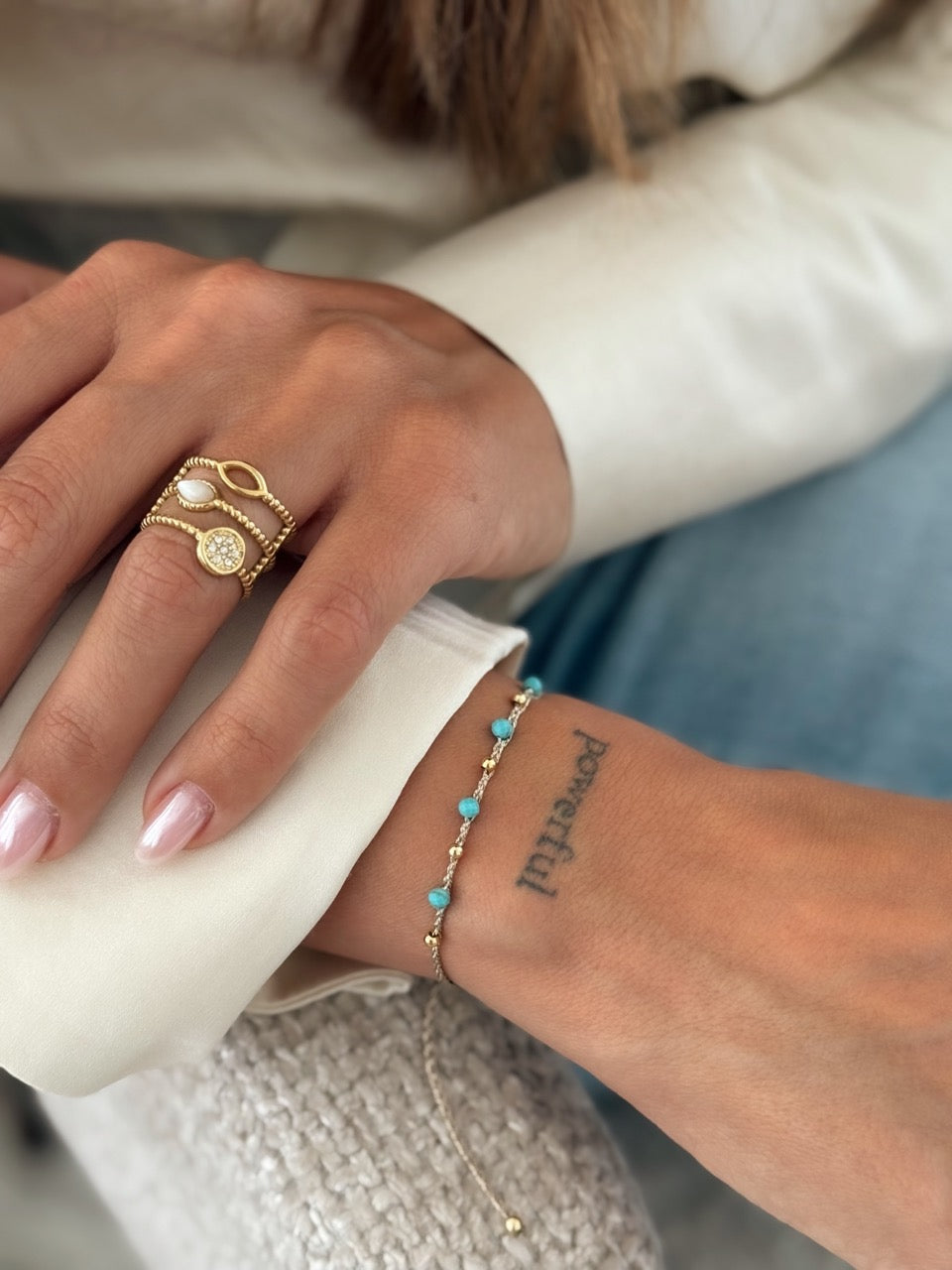 Pierres naturelles et perles en acier inoxydable tissées sur corde dorée.