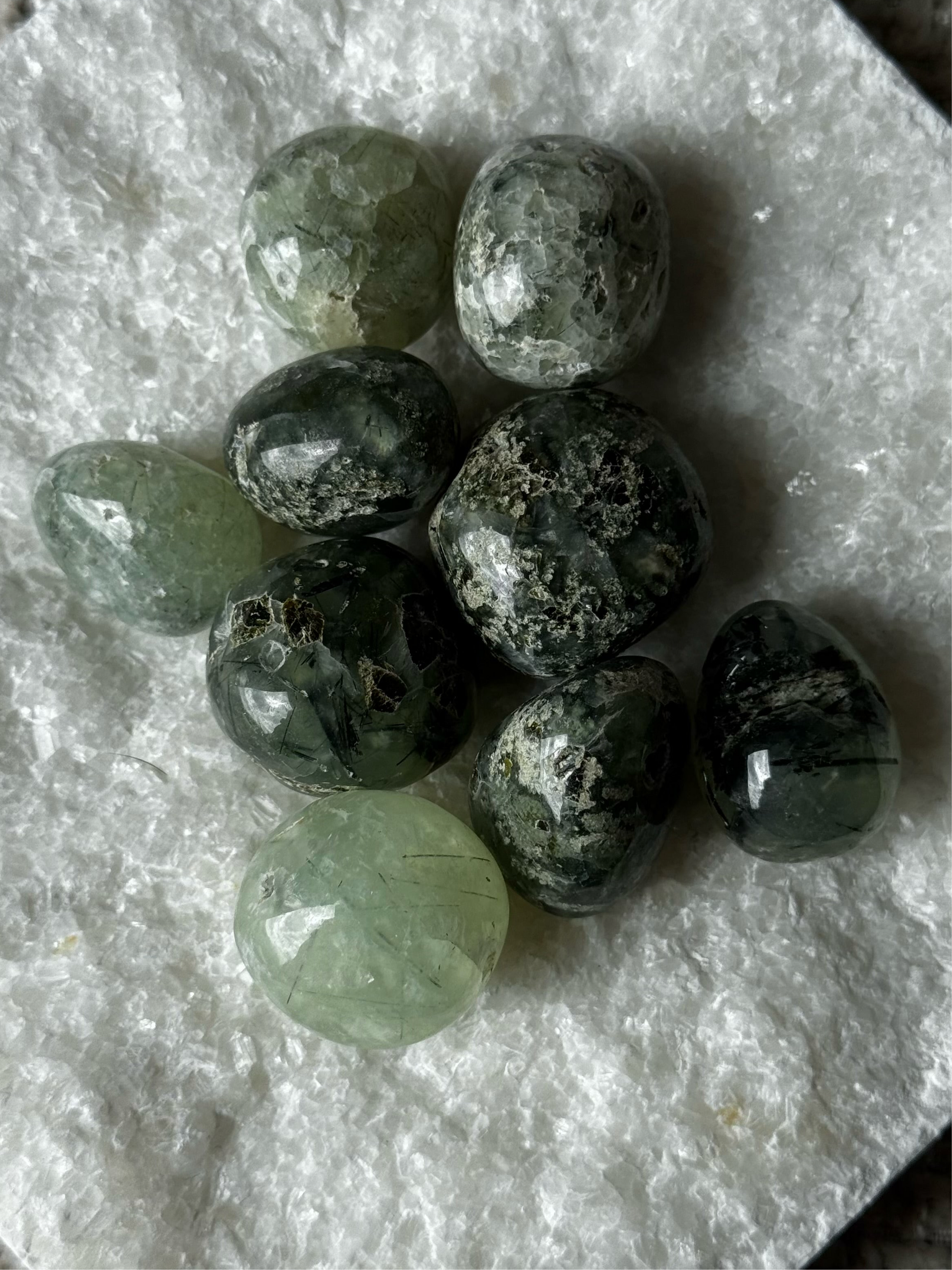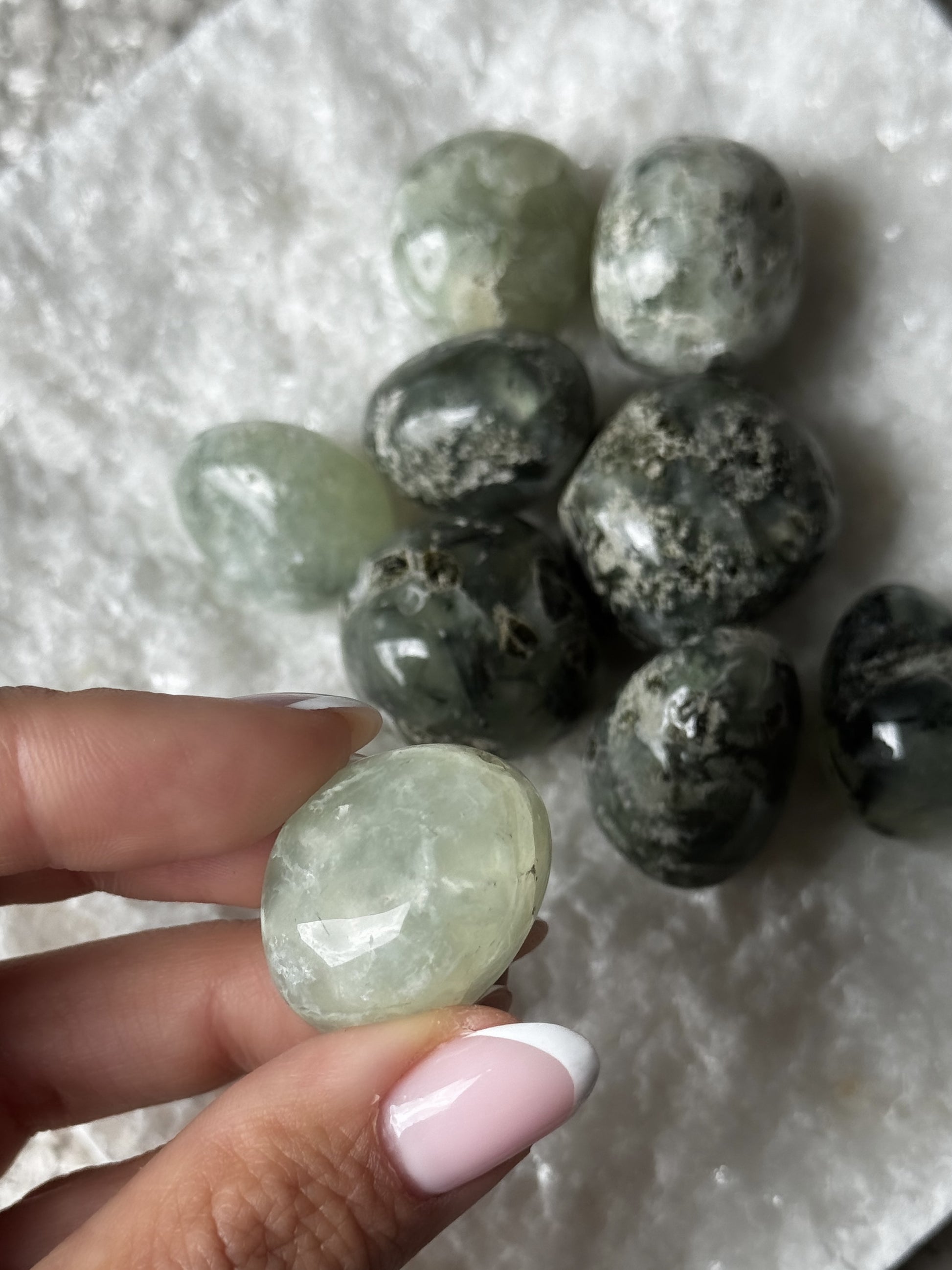Moi c'est Préhnite, je vais permettre de combattre vos peurs et vos angoisses. Je protège des mauvais rêves en développant votre spiritualité. J'apaise particulièrement les personnes souffrant d'un trauma émotionnel.